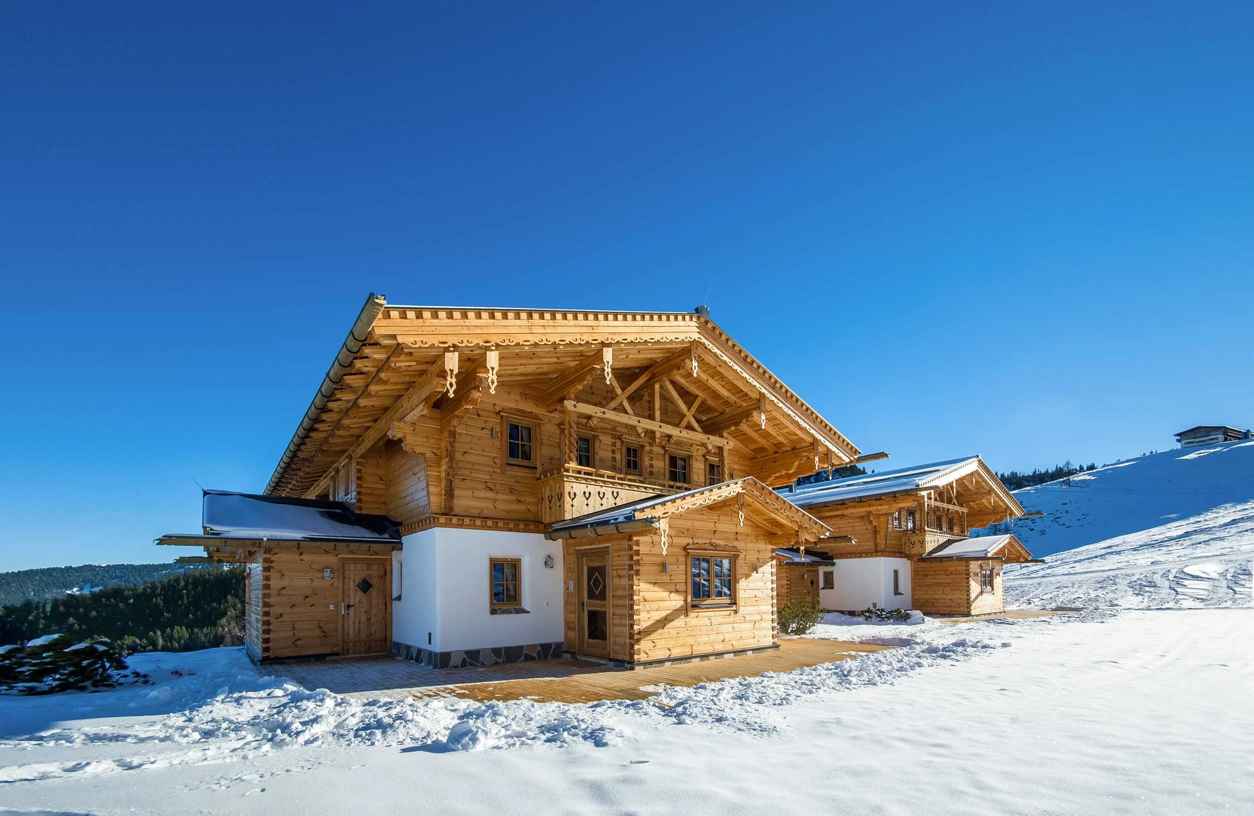 „Für unsere Holzblockhäuser haben wir schon viele Auszeichnungen und Preise erhalten wie zum Beispiel 2019 den Holzbaupreis Kärnten für ein Hotelprojekt auf der Turrach. Dabei kooperierten wir mit dem Architektenbüro Winkle & Ruck“, erzählt der leidenschaftliche Holzbaumeister. Das Leistungsspektrum reicht vom Holzrohbau bis hin zum Dach. „Jedes Haus wird von uns individuell geplant, weil es für den Bauherrn schon interessant ist, wenn er alles aus einer Hand bekommt“, informiert Schober. Speziell das Blockhaus hat für den Unternehmer spezielle Anforderungen, die zu beherzigen sind. Eine davon sind die Verstrickungen der Eckverbindungen – genannt das „Tiroler Schloss“ –, die extrem stabil sein müssen.